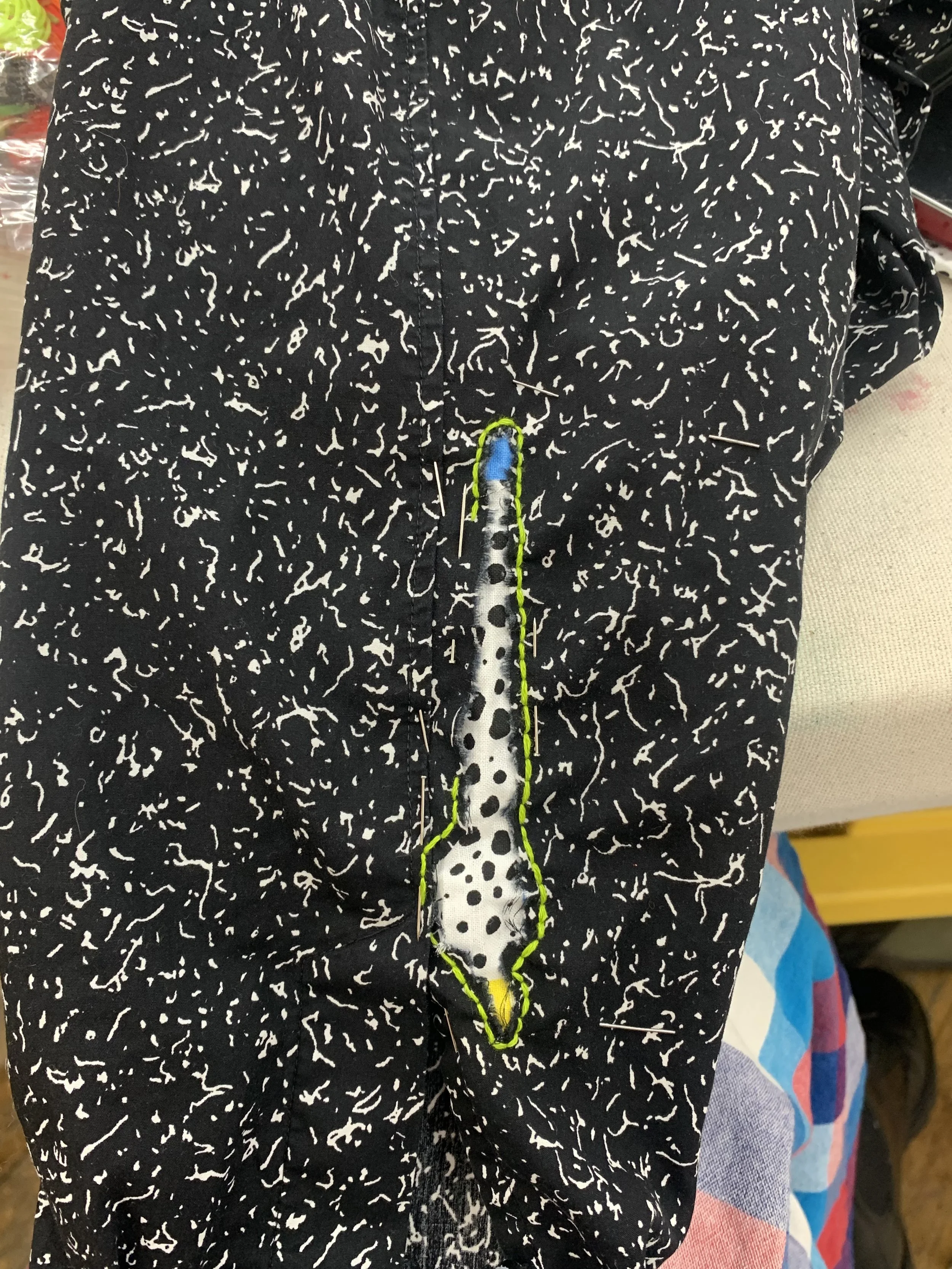 My partner loves this abstractly-patterned, button-down shirt, but one of the sleeves was torn. I patched, from the inside of the shirt, with this wonderfully polka-dotted fabric and outlined it in boldly colored embroidery floss.